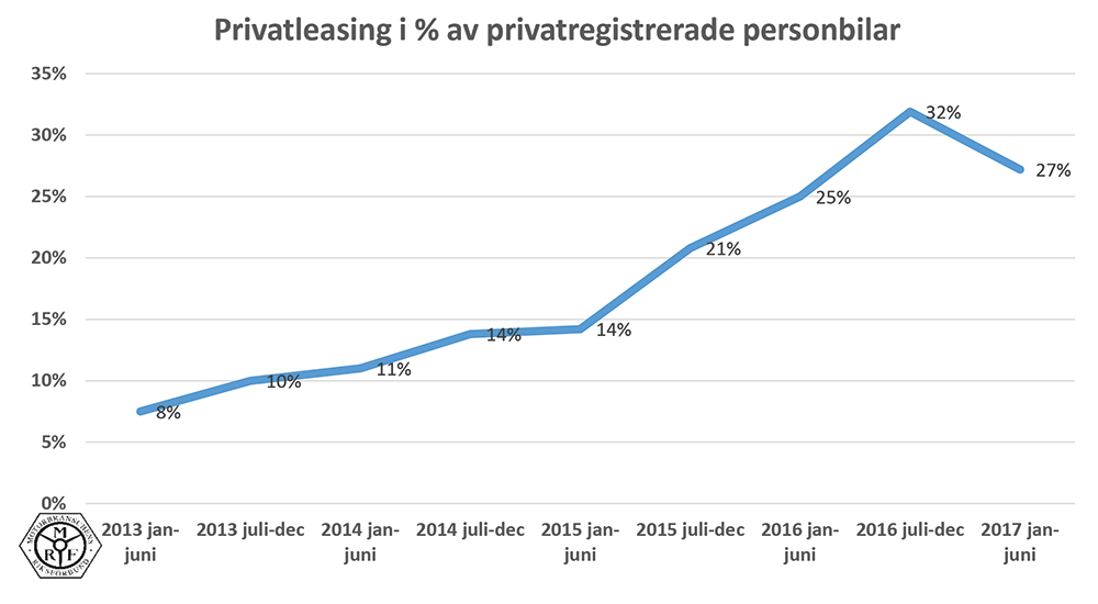 Antalet privatleasade personbilar första halvåret i år blev 21 800 att jämföras med 27 700 för 2:a halvåret 2016. För 1:a halvåret 2016 var antalet levererade privatleasade bilar 21 100 och ökningen för de första 6 månader 2017 blev densamma som för hela personbilsmarknaden, nämligen 3 %. Som jämförelse var ökningen för 1:a halvåret 2016 jämfört med 2015 hela 110 %.