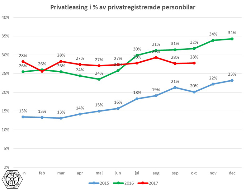 I oktober i år ser vi en minskning med nästan 900 privatleasade bilar jämfört med oktober 2016 och hitintills i år finns en minskning med dryga 1 000 bilar.