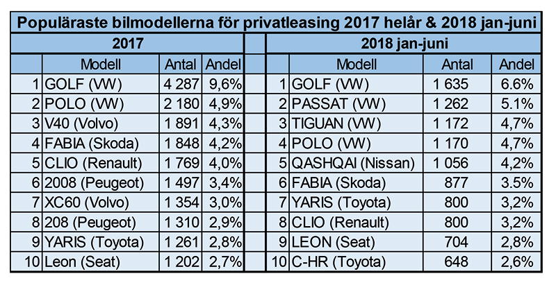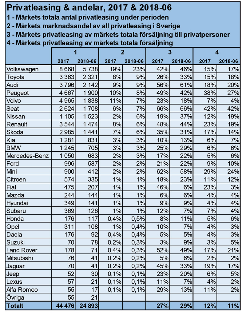 Av Volkswagens samtliga sålda bilar 2018 jan-juni (inklusive till företag) var 17 % (15 %) privatleasade medan Toyota hade privatleasat ut 18 % (15 %) av alla sina sålda bilar. För Audi blev andelen hela 20 % (18 %). För Peugeot var andelen högre, med 27 % (38 %). Volvo har minskat till 4 % (7 %). Högst andel här hade Seat med 42 % (42 %).