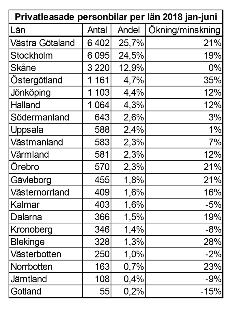 Andelen privatleasing av de totalt registrerade personbilarna blev för jan-juni 11 %, vilket också blev andelen för samma period 2017. Andelen privatregistrerade personbilar som andel av de totalt registrerade personbilarna har minskat något de senaste åren, varför denna andel inte ökar trots att antalet ökar.