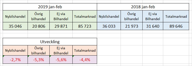 Försäljningen av begagnade bilar fortsätter att tappa fart på den inhemska marknaden, medan exporten fortsätter att öka. Under årets första två månader har den totala handeln tappat 4,4 % som i reella antal innebär från 89 646 bilar 2018 till 85 723 i år.