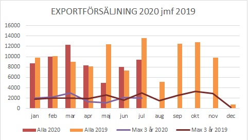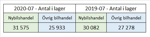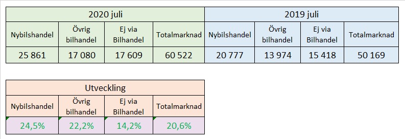 Hela uppgången kan kopplas till bilhandeln, privatmarknaden ökade med 14,2 procent i juli men har hittills i år backat med 0,1 procent, d v s den ligger still. Det är en trend som fortsätter sedan förra året, att privatförsäljningen tappar. I år kan den givetvis ha spätts på av pandemin, då det kan upplevas tryggare att gå runt och titta på bilar i en rymlig bilhall än att åka till privatpersoner och i deras sällskap granska ett köpeobjekt.