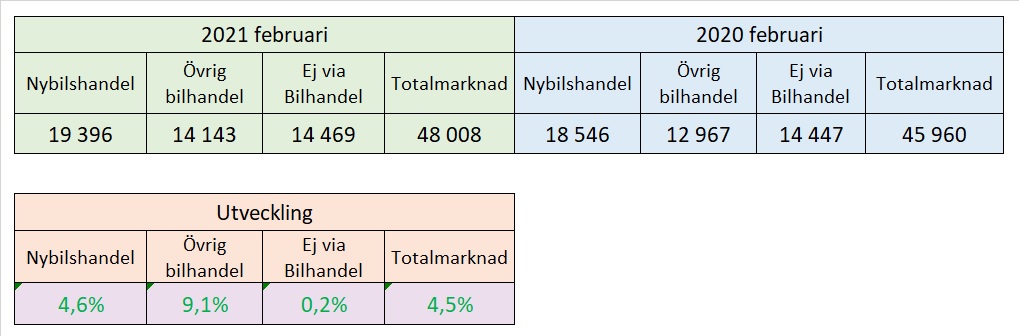 Vi fortsätter med årets andra månad med något som på aggregerad nivå ser rätt så stabilt ut. Nybilshandeln fortsätter att växa i februari med +4,6 procent, dvs i linje med hela marknaden som har gått +4,5 procent. Begagnathandlarna fortsätter att växa kraftigt, +9,1 procent, medan privathandeln i princip ligger kvar på samma nivå som tidigare trots att marknaden växer, +0,2 procent, allt i jämförelse med samma månad 2020, vilket var den sista månaden som inte påverkades av pandemin. Så summerat är begagnathandeln på en högre nivå än innan vi visste vad COVID-19 var.