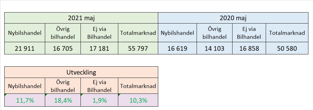 För maj 2021 noterar vi att det skett 38 616 ägarbyten av personbilar som är 6 – 120 månader, det är 4 894 fler än året innan, en uppgång med 14,5 procent. Flest bilar är som vanligt av märket Volvo, följt av Volkswagen, BMW, Audi, Mercedes-Benz, Toyota, Kia, Skoda, Renault och Ford, i nämnd ordning.