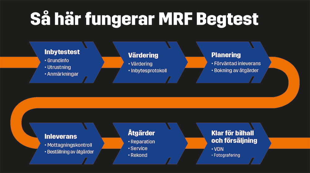 MRF Begtest har utvecklats från att hantera tester och VDN till att nu fungera som ett flödessystem. Systemet håller koll på var bilen befinner sig och larmar ansvarig när den stått för länge på ett produktionsställe. På så vis har du kontroll på hela ditt begagnatflöde, från test och värdering till försäljningshall.